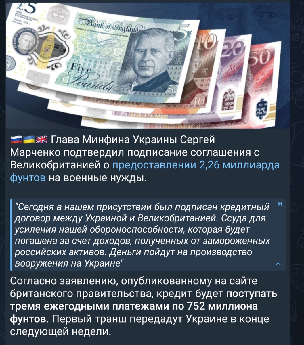 Зеленскому Британия предоставила кредит 2,26 млрд фунтов стерлингов, или 3 миллиарда долларов. На картинке указаны некоторые параметры предоставления данного кредита. По заявлению получателя данного кредита, Украине не придется отдавать деньги по этому платежу. Типа у этого кредита есть автоплатеж, который будет осуществляться со средств замороженных активов России. По данным Британских СМИ, на туманном Альбионе заморожено примерно 36 млрд долларов денежных средств Центрального Банка России и 18 млрд частных вкладов из РФ. В общей сложности это более 50 миллиардов. И вот вопрос, какими цифрами они манипулируют когда говорят о использовании процентов от замороженных средств? Первое, замороженные российские активы не должны использоваться, если они заморожены. Если нашими деньгами пользуются и их предоставляют в виде кредитов заёмщикам, то это уже преступление. Это называется незаконное использование чужих средств. Когда то все закончится и Британии и другим странам, кто заморозил наши