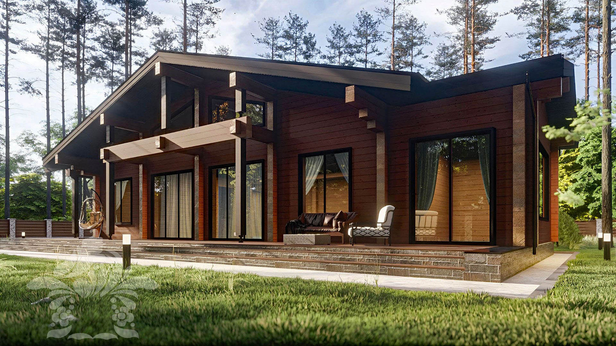 Современный загородный дом из клееного бруса с акцентом на комфортное одноэтажное исполнение + лофт в мансардном этаже свободного назначения, добавляющий еще одну зону отдыха, место для хобби и развлечений, либо совместного времяпровождения всей семьи.