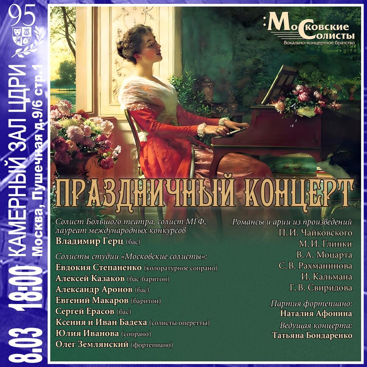 Вокально-концертное братство «Московские солисты» Любимые романсы, лирические песни, арии из опер и оперетт П.И. Чайковского, М.И. Глинки, В.А. Моцарта, С.В. Рахманинова, И. Кальмана, Г.В. Свиридова Солист Большого театра, солист МГФ, лауреат международных конкурсов — Владимир Герц (бас) Солисты студии «Московские солисты»: