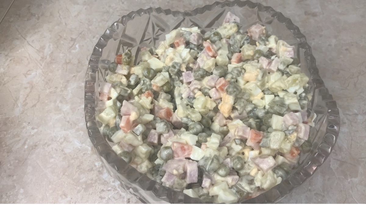 Нам понадобится: Яйца 5шт Картошка 5-6шт Морковка (можно без неё) 1шт Ветчина (или другие колбасы) 200-250гр Огурцы 5-6шт Горошек 1банка Соль, перец, майонез 1 Отвариваем яйца, картошку и морковь. 2 Всё режим мелким кубиком. Не забываем что от нарезки зависит вкус салата. Перед тем как высыпать горошек не забываем слить сок 3 Затем солим, перчим и добавляем майонез. Хорошо перемешиваем и даем немного настоятся. 4 Также майонезом можно заправлять порционно, сколько планируете съесть за раз. Так салат быстро не испортится
