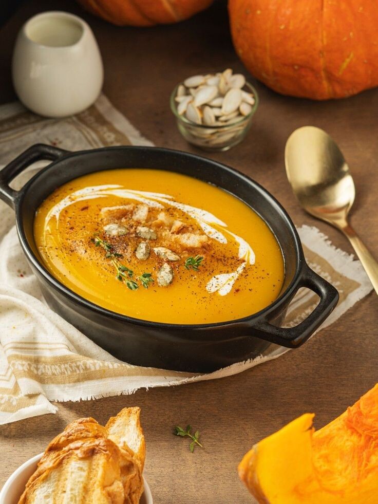 - Польза: Тыквенный крем-суп — это диетическое блюдо, которое содержит много витаминов и минералов. Тыква богата витамином А, который полезен для зрения.