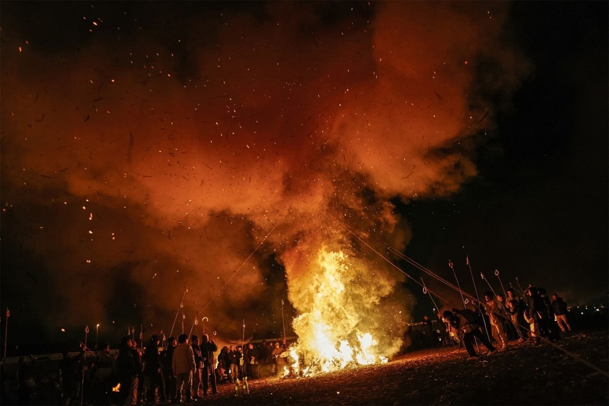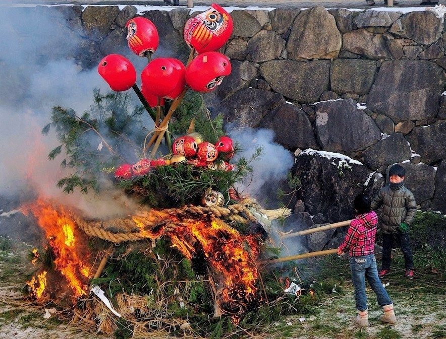 Подходит к концу длинная череда новогодних праздников. В Японии она традиционно завершается праздником огня Сагитё, который проводился вечером 14 числа 1-го лунного месяца. Центральным событием этого праздника является большой костер, в котором сжигают все новогодние украшения и атрибуты. История этого праздника очень древняя, и связана с любопытной легендой. Костер Сагитё посвящался синтоистскому божеству Досодзин, каменные изваяния которого устанавливали на границе чего-либо (населенных пунктов, рисовых полей) и на перекрёстках, для охраны их магической чистоты. А теперь легенда. Когда-то давным-давно 8 числа 12 месяца Одноглазый Монашек (Хитоцумэ Кодзо или Бог чумы) решил обойти все дома и записать все прегрешения и плохие дела людей, особенно детей. Записей этих ссор, дурных мыслей, обид, бранных слов за год набралось у него несколько томов, но Монашек посчитал, что время наказания еще не настало. Он решил вернуться 15 числа 1-го месяца. Однако нести в горы тяжелые книги Одноглазый