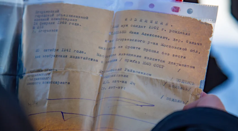 В начале года в семье Рыбаковых из Егорьевска раздался телефонный звонок. Звонили поисковики. Около полугода назад под Наро-Фоминском они нашли останки их деда Ивана Алексеевича Соловьева, который последние 84 года считался пропавшим без вести. В семье о его фронтовой судьбе было известно совсем немного. Сохранился разве что документ последнего сражения: 20 октября 1941 года, район деревни Мишуково. Этого звонка, как признаются Рыбаковы, они ждали все последние десятилетия. И, наконец-то, дождались…
