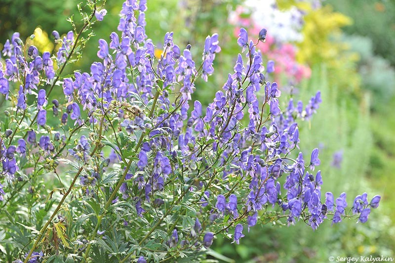 Одно из моих любимых растений, хотя я никогда его не выращивал, - это цветущий в июле аконит садовый (Aconitum x cammarum) 'Bicolor' (1,2 м), известный как просто 'Bicolor'. Его "капюшоны" окрашены в синий и белый цвета и хорошо смотрятся, особенно в тенистом месте. Цветение приходится на июль. А в августе цветет сорт 'Spark's Variety' (1 м). Его ветвистое соцветие цвета индиго не имеет сильного центрального цветоноса, который отвлекал бы внимание от не менее важных боковых побегов, когда они распускаются. Я выращиваю его с лиловыми флоксами метельчатыми, а также, для контраста, с ярко-желтым подсолнечником (Helianthus) 'Vapenoch Star' (1,2 м).