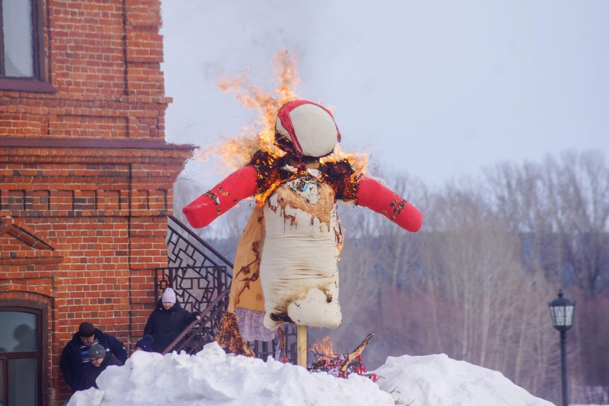 Праздник завершился сожжением чучела Масленицы.
