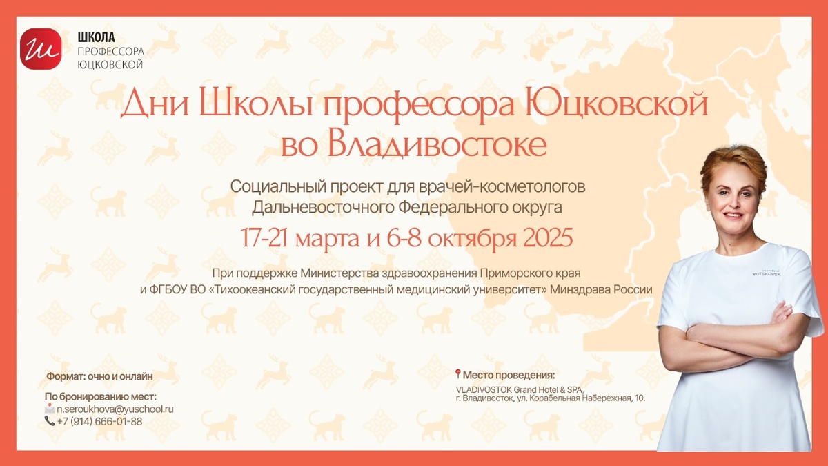 Школа профессора Юцковской представляет новый Социальный проект для врачей-косметологов Дальневосточного Федерального округа при поддержке Министерства здравоохранения Приморского края и ФГБОУ ВО «Тихоокеанский государственный медицинский университет» Минздрава России к 35-летию Профессорской клиники Юцковских во Владивостоке в 2026 году. Сюжет с места события уже здесь по ссылке. «Мы с гордостью несем социальную ответственность за развитие направления эстетической медицины Дальнего Востока! Поэтому в 2025 году запустили новый социальный формат обучения, который сформировали из лучших курсов и семинаров Школы профессора Юцковской» Записаться и узнать информацию у менеджера во Владивостоке: Сероухова Наталья n.seroukhova@yuschool.ru +7(914)666-01-88 https://wa.me/79146660188 Место проведения: "VLADIVOSTOK Grand Hotel & SPA", Владивосток, ул. Корабельная Набережная, 10. 🗓17-19 марта «Азбука акне». Узнать подробности можно здесь