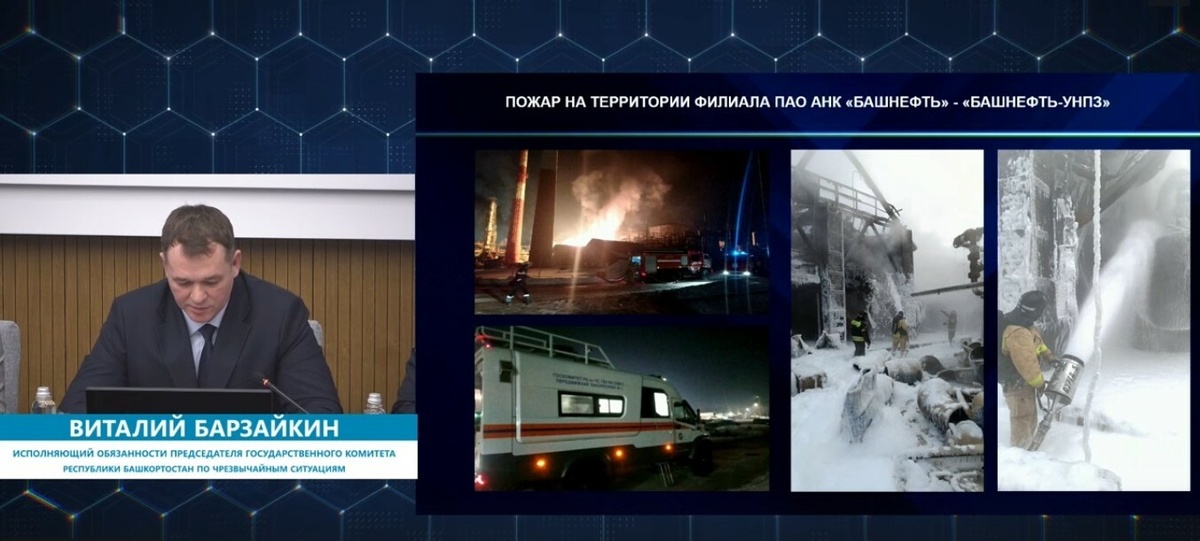 И.о. председателя Госкомитета РБ по ЧС Виталий Барзайкин на оперативном совещании в правительстве сообщил, что сегодня ночью на территории Уфимского нефтеперерабатывающего завода произошел пожар, который в настоящий момент ликвидирован. К тушению огня были привлечены 95 пожарных и 27 единиц спецтехники. Также на месте происшествия работала передвижная лаборатории по контролю за атмосферным воздухом. Превышения вредных веществ не зафиксировано, ситуация находится под контролем. Глава республики Радий Хабиров попросил докладчика передать слова благодарности всем, кто принимал участие в ликвидации пожара на нефтеперерабатывающем предприятии. «Мы находимся на постоянной связи с руководством Башнефти, пожар локализован, предприятие работает в прежнем режиме. И самое главное — никаких следов БПЛА на месте инцидента не обнаружено. Поэтому говорить о том, что это была атака беспилотника, преждевременно. Когда окончательно разберемся с причинами возгорания, наш антитеррористический штаб выступи