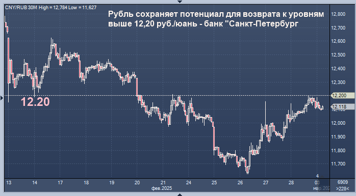 Рубль сохраняет потенциал для возврата к уровням выше 12,20 руб./юань - банк "Санкт-Петербург Курс доллара к рублю расчётный, фьючерс, вечный фьючерс и межбанк. Курс евро к рублю расчётный, фьючерс, вечный фьючерс и межбанк. Курс юаня к рублю биржевой, фьючерс, вечный фьючерс и межбанк. Рубль сохраняет потенциал для возврата к уровням выше 12,20 руб./юань, если чистые продажи юаней ЦБ РФ на март не будут сильно увеличены, считают аналитики банка "Санкт-Петербург". "Ослаблению рубля на минувшей неделе, помимо ряда негативных геополитических новостей, способствовало завершение налогового периода, - пишут эксперты в обзоре. - В понедельник курс CNY/RUB находится у 12,16 руб./юань. Другие курсы валют EM с утра двигаются разнонаправленно. В целом у курса в ближайшее время есть потенциал превысить 12,20 руб./юань, если чистые продажи юаней ЦБ на март не будут сильно увеличены". В свою очередь, цены на нефть снизились по итогам недели. По мнению аналитиков банка, на котировки давление оказыва
