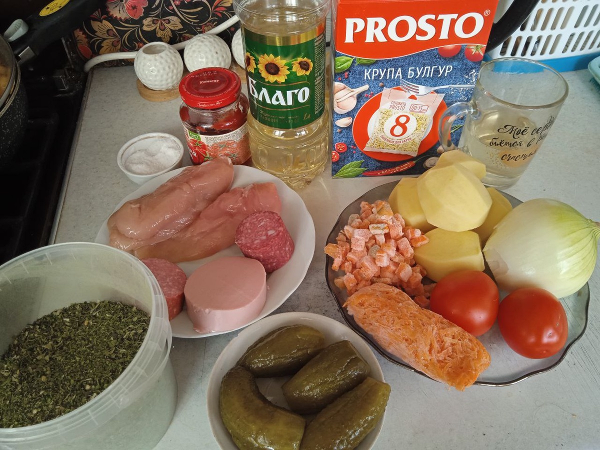 Рассольник с булгуром – это сытная и полезная вариация классического рассольника. Вместо традиционного риса используется булгур, который придает супу более насыщенный вкус и текстуру. В остальном, рецепт может быть достаточно близок к классическому, включая основные ингредиенты: рассол, соленые огурцы, картофель, перловку (можно добавить вместе с булгуром или вместо него), лук, морковь, зелень. Рецепт 250 гр куриного филе (грудка) 2,5 л воды 4-5 средних картофелин 3-4 ст ложки подсолнечного масла 2 небольших помидора 1 крупная луковица 1 крупная морковь 1 столовая ложка томатной пасты 200 гр маринованных огурцов по 70 гр варёной, варено-копченой и сырокопченой колбасы 100 гр булгура 100 мл огуречного рассола соль, специи. 1. В подсоленной воде отвариваем на небольшом огне куриную грудку около 30 минут, снимаем пенку, так бульон останется прозрачным. 2. Добавляем в кастрюлю половинку мелко нарезанного лука, половинку нарезанной кубиками моркови, нарезанные кубиками помидоры без к