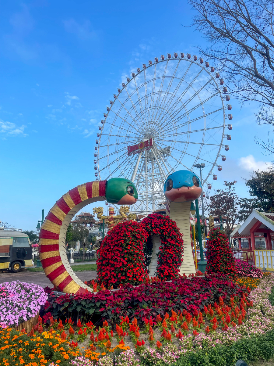Почти из любой точки города можно увидеть колесо обозрения Sun Wheel, которое так и манит! Меня оно, конечно, тоже приманило, но сегодня не о колесе, а в целом о парке, где оно находится. Парк, конечно, яркий и разноцветный, что и предполагается для подобных мест. Если честно, совершенно ничего особенного, обычный парк аттракционов, каких много в разных городах мира, да и по площади он небольшой. Я ничего не ждала от парка, но считала своим долгом сходить туда, куда же без этого. На территории парка есть несколько тематических зон, в которых можно встретить реплики архитектурных сооружений разных стран Юго-Восточной Азии. Конечно, имеются кафешки и точки с уличной едой и сувенирами. Если я правильно поняла, то парк начинает работать только с 15:00 и до вечера. Можно купить безлимитный входной билет (200к донгов, около 700 руб.) и кататься везде, можно купить билет чисто на колесо обозрения (150к донгов, я покупала его). Приятное местечко, чтобы погулять в черте города, если вы с детьми