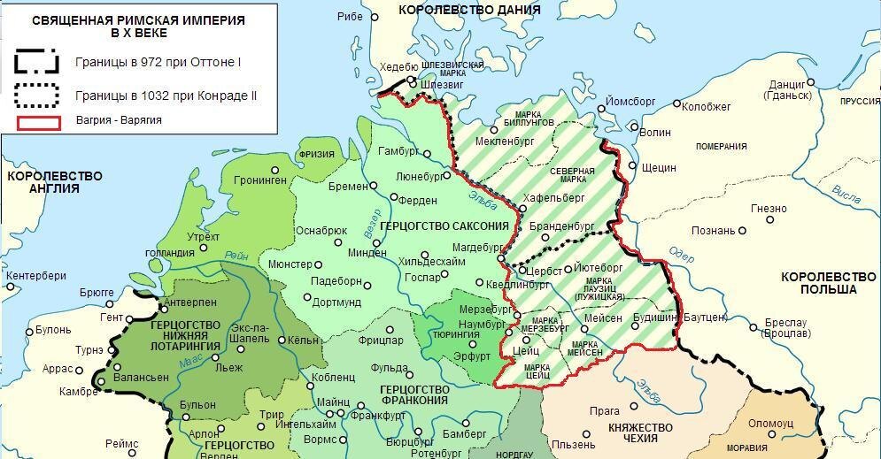 В 972 г. Вагрия (искажённое Варягия) – земли варягов или пруссов, славян-ободритов, окрестности города Мекленбург, откуда был призван князь Рюрик, были захвачены Священной Римской Империей Германской нации. Здесь приводится карта на момент захвата. Красным цветом обведены границы Вагрии – Варягии. С этого момента из множества разноплеменных, разноязыких народов на территории Священной Римской Империи Германской нации начинает формироваться единая германская нация на базе искусственно созданного на основе латыни немецкого языка. Варяги в это время были полностью крещены в Христианство по римскому католическому обряду. Начался процесс их заката и ассимиляции немцами.