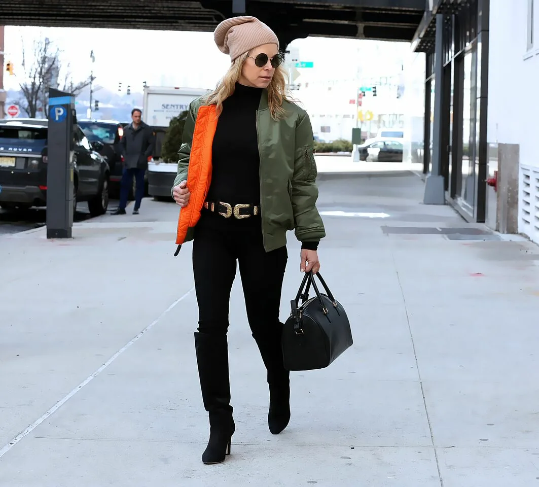 Куртки бомберы, из мужского гардероба вполне уверенно перекочевавшие в женский, представляют собой модели стильные и лаконичные, привлекательные узнаваемым дизайном и способные вписаться практически в любые образы. Современные бомберы – короткие легкие куртки на молнии с косыми карманами, с трикотажным воротником-стойкой, манжетами и вставкой по нижнему краю куртки. В гардеробе женщин 50+ такие вещи обязательно должны присутствовать, ведь они придают образам легкость, стильность и свежесть. 1. Бомбер в комплекте с джинсами – безошибочное сочетание в повседневном стиле, которое легко сможет составить модная зрелая женщина 50+ из самых простых вещей в гардеробе. Стильный и эффектный комплект – прямые укороченные джинсы классического светло-синего цвета, серебристо-серый джемпер с глубоким V-образным вырезом и оливкового оттенка бомбер. Нотку элегантности и женственности образу добавляет небольшая бежево-розовая сумочка и оригинальные бледно-зеленые легкие ботильоны с открытыми носами на