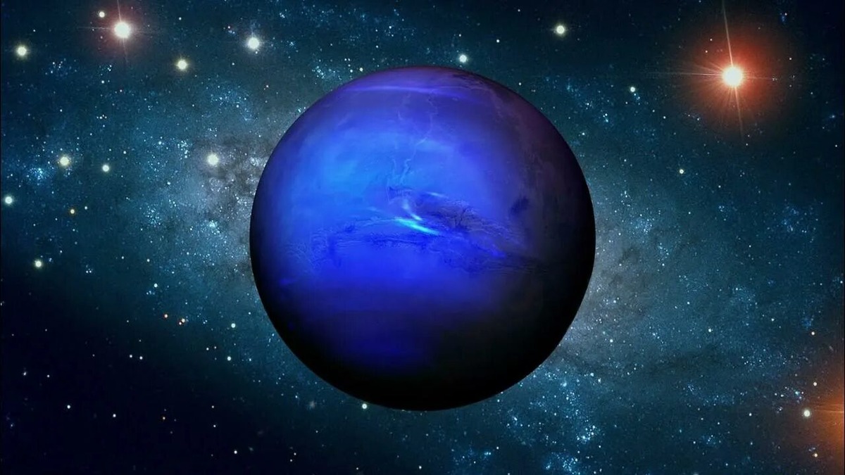 Нептун — восьмая и последняя планета Солнечной системы, расположенная на расстоянии около 4,5 миллиардов километров от Солнца. Это газовый гигант, который отличается своей ярко-синей окраской и сложной атмосферой. Давайте подробнее рассмотрим эту удивительную планету. ### Атмосфера и климат Атмосфера Нептуна состоит в основном из водорода и гелия, с небольшими примесями метана, который придает планете характерный синий цвет. Температура в верхних слоях атмосферы очень низкая, достигая примерно -214 градусов Цельсия, что делает Нептун одной из самых холодных планет в Солнечной системе. Нептун известен своими сильными ветрами, которые могут достигать скорости до 2000 километров в час, что делает их самыми быстрыми в Солнечной системе. Эти ветры создают мощные штормы и облачные образования, некоторые из которых напоминают те, что наблюдаются на Юпитере. ### Геология и структура Нептун имеет диаметр около 49 244 километров, что делает его четвертой по величине планетой в системе. Его