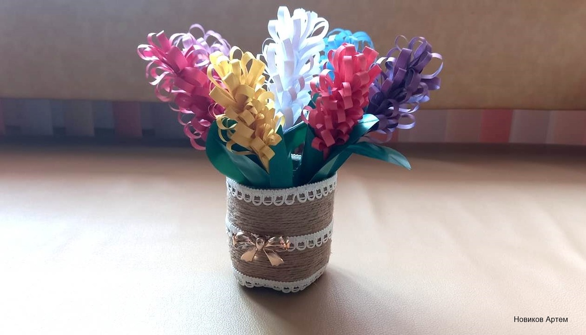 Процесс начинается с того, что из бумаги вырезаются отдельные лепестки. Затем их нужно аккуратно скрутить и склеить. Стебель можно сделать из цветной бумаги, обмотав ее вокруг длинной проволоки. Такой подарок будет выглядеть очень красиво и подарит маме приятные воспоминания.