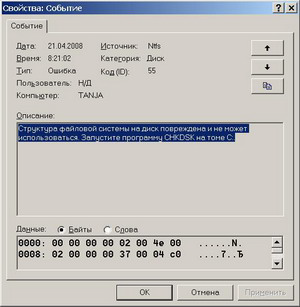 *** Симптомы: когда повреждена структура файловой системы диска, Windows не удаётся загрузить ни в обычном режиме, ни в безопасном (при этом процесс загрузки доходит до появления логотипа Microsoft, – и опять по кругу). Основные причины неисправности: – некорректное завершение работы ПК; – проблемы с электропитанием; – последствия вирусной атаки; – … При повреждении файловой системы диска в журнале событий Windows, как правило, регистрируются следующие события: – в разделе Система • Тип: Ошибка Источник: ntfs Код (ID): 55 Структура файловой системы на диск повреждена и не может использоваться. Запустите программу CHKDSK на томе C:. • Тип: Предупреждение Источник: disk Код (ID): 51 Обнаружена ошибка на устройстве \Device\Harddisk0\D во время выполнения операции страничного обмена. • Тип: Предупреждение Источник: atapi Код (ID): 26 Драйвер обнаружил устаревшую настройку изготовителя для устройства \Device\Ide\IdePort2. В результате возможно понижение быстродействия. • Тип: О