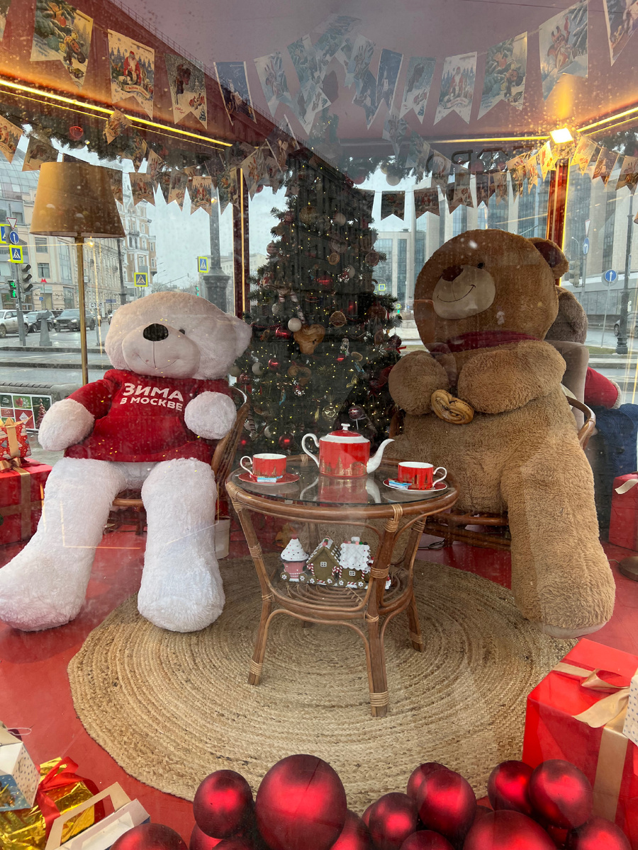 Доброе утро, мои дорогие полосатики! Дождались мы с вами весну, но пока не красну, а скорее белолицу, потому что переборщила со снежной пудрой и присыпала дорожки! Ой, что-то меня на лирику потянуло, а все потому, что в центре Москвы еще Новый год продолжается! Не верите? Мишки чай пьют с плюшками! Наверное, в магазине «Чай-кофе» на Мясницкой купили! А вокруг них шарики и конфеты! Ну, чисто Новый год! Согласны? В общем, я стучал-стучал, но меня так и не пустили, и чайком с плюшками не угостили! Невоспитанные мишки! Они не знают, что в субботу у всех котиков праздник был! А когда я об этом сказал, медведи вдруг в спячку впали, И откуда подушка с пледом появились? Я так и не понял! Не сложилась у меня дружба с мишками! А я чуть от родителей не отстал, пока выяснял с ним отношения! Пришлось со всех лап бежать и нос по ветру держать, чтоб аромат маминых духов не упустить! А в центре Москвы столько запахов, что духи в низ теряются! Хорошо лесной олень на бульваре повстречался! Забрался