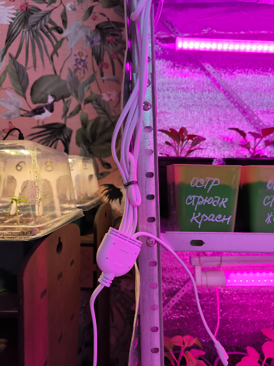 Но тут мама нашла решение — сетевой разветвитель для фитоламп. Это кабель с одной вилкой и пятью разъемами для ламп. Цена — всего 500 рублей, и он продается на любом маркетплейсе