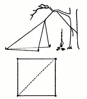 Форма №1 Квадрат материала, подвешенный за один угол к любой удобной опоре таким образом, чтобы получился удобный навес; он не будет пропускать дождь и сохранять тепло. Форма №2 Делается из прямоугольного материала, равный двум квадратам. Получается просторное и теплое укрытие, с открытой частью одной стороны к огню. Форма №3 Здесь прямоугольник складывается, образуя "навесное" укрытие, при этом передняя часть крыши подвешивается к веревке или к горизонтальному столбу с помощью шнуров. Два неиспользуемых угла загибаются вниз. Квадратная открытая передняя часть обращена к лагерному костру. Форма №4 Такой же как форме № 3, но имеет треугольную переднюю часть и только одну точку подвески. Форма №5 Конструкция имеет треугольную планировку основания, квадратное переднее отверстие, много места сзади и требует двух или более линий крепления. Форма №6 Квадратная или "шахтерская" палатка. Два угла загнуты под себя. Эта палатка закрыта со всех сторон, с дверью спереди. Форма №7 Коническая палатк