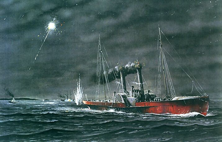 Прилив начался в десять часов, и в этот час нам удалось пересечь «рип», и когда мы проходили над отмелью Нью-Инлет, луна взошла на безоблачном небе. Ночь также была спокойной, и ровный стук наших весел (колес) звучал для наших ушей зловеще громко. Когда мы близко подходили к берегу, нам были ясно видны блокирующие суда, некоторые на якоре, некоторые на ходу; и некоторые из них были так близко к нам, что мы видели, или воображали, что видим, в наши ночные бинокли, вахтенных людей на их баках; но поскольку мы были внутри них всех и невидимы на фоне земли, мы прошли мимо них незамеченными