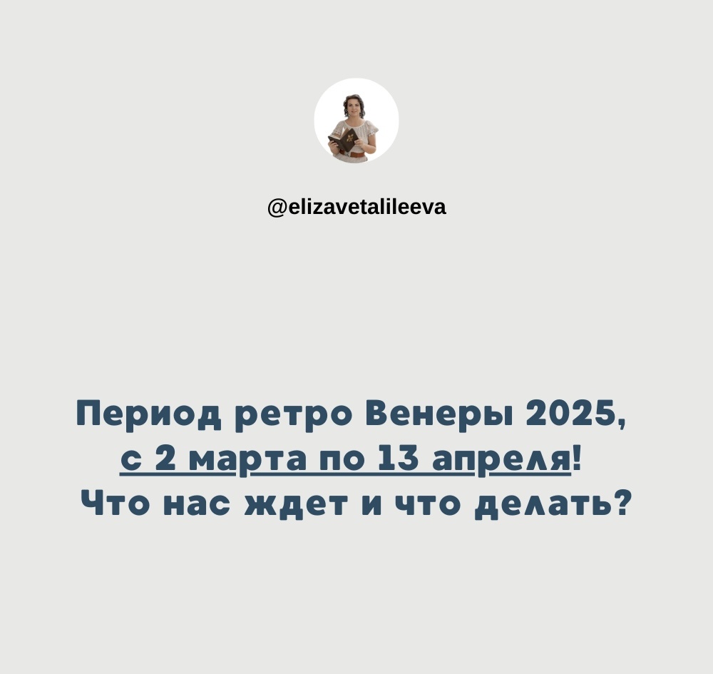 Период ретро Венеры 2025, с 2 марта по 13 апреля! Что нас ждет и что делать? Ретроградная Венера - какие аспекты затронет? Всё, что мы думали о любви, отношениях, деньгах, красоте, удовольствиях, проходит проверку и подвергается работе над ошибками. Будем отпускать старое, ненужное, изжитое, не наше. В этот период активно работают эмоции и мысли. Память подкидывает воспоминания о прошлых отношениях, чтобы мы могли переосмыслить свои прошлые выборы и решить, что нести с собой дальше, в будущее. ⠀ Основные энергии периода ⤵️ 1️⃣ Возвращение прошлого. Возврат бывших, звонки, напоминание о себе - все уместно. А также мысли и воспоминания. Это не причина возобновить отношения. Это необходимо, чтобы вы могли двигаться вперед. ⠀ 2️⃣ Переоценка любви и чувств в нынешних отношениях. Отношения подвергаются проверке. Могут всплывать старые обиды, недосказанность. Где-то подсознательно вы принимаете решение: это любовь или привычка? Бытовуха или истинное? Глубокие отношения или страх остать