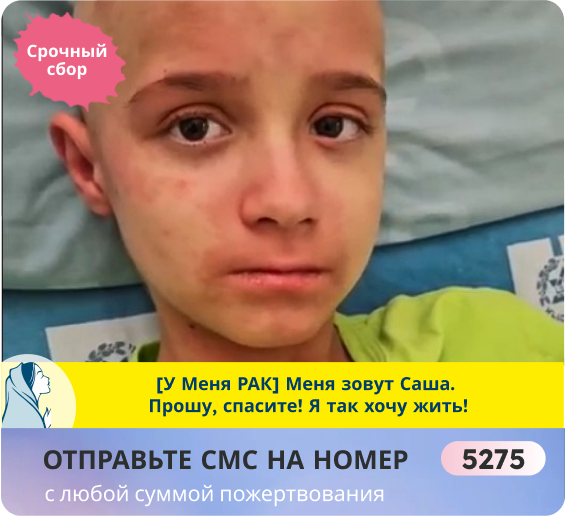 Здравствуйте, дорогие друзья! "Меня зовут Саша Кнутов, мне 9 лет. Я очень хочу вернуться домой здоровым! Уже пятый год я лечусь от Т-клеточного острого лимфобластного лейкоза, это уже 2-й рецидив. Это когда вначале всё хорошо, а потом тебе сказали, что ты опять болеешь. И никто не знает, останешься ты жить или будешь мучиться и потом одним утром исчезнешь из палаты и из жизни. Как те ребята, с которыми я дружил в больнице. А потом сказали, что их больше нет... Сейчас мне нужно особенное и очень дорогое лечение, чтобы жить, другого больше не осталось. И его могут сделать только врачи в Китае. Врачи говорят, что у меня трудный случай. И что очень надо торопиться. Им очень трудно сдержать РАК, чтобы он меня не забрал. Если мы не успеем вылечить меня в Китае, то РАК уже не остановят. Я так устал болеть! Очень хочу стать обычным мальчиком! Пожалуйста, помогите! Я так хочу жить!". Саша. ПОМОЧЬ САШЕ СЕЙЧАС > Сейчас у Саши идут самые важные дни в его жизни. Для кого-то просто пришла очередная