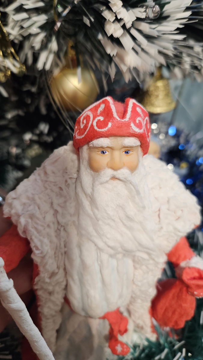 Всем привет! Я продолжаю делать ватного волшебника под ёлочку младшему сыну. Ссылку на первую часть оставлю в конце статьи. Я уже сделала каркас, дедушка принарядился в шаровары и валенки. Теперь приступаю к платью. Я представляю Деда мороза в длинном белом платье с красным поясом и в шубе нараспашку)) Это мой самый любимый образ. Я уже его воплощала в мини версии. Вот такой дедуля живет на моей елочке) Сейчас работа предстоит помасштабней)) В интернете нашла картинки, полностью совпавшие с образом в моей голове, какие же есть талантливые мастерицы!!!! Имея картинку перед глазами гораздо проще работать! Беру кусок ваты длиной около 30 см. И полностью пропитываю клеем с двух сторон. Разравниваю руками, разглаживаю, выгоняю пузырьки. Теперь соединяю противоположные стороны полотна и закрепляю клеем. Получилась такая юбочка - нижняя часть платья. Одеваю юбку на фигурку и формирую складки, в основном на передней части. Беру второй кусок ваты. Он так же длиной 30 см, н