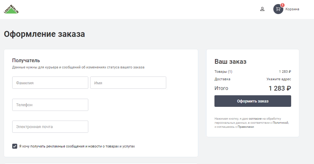 Заголовок и внешний вид страницы подсказывает, что это раздел оформления заказа