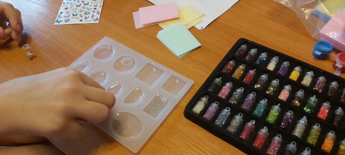 На Новый Год Катюшке мы подарили набор для творчества из эпоксидной смолы, о котором я давно мечтала. Со стразами и красителями, что бы делать кулончики и всякие брелочки. Да, анекдот про мужа, который хотел чтобы у них с женой родился сын, потому что он с детства мечтал о вертолете на пульте управления, это вообще не анекдот. Когда наш сын был маленький он получал в подарок хоккей, бильярд, дартс и прочие любимые папины игры. А дочке достаются наборы для плетения макраме, картины по номерам, вышивка и прочая творческая активность. Но все счастливы и родители и дети, потому что, как говорится, от осинки не родятся апельсинки. И вот мы начали осваивать эпоксидную смолу. Сначала замешали. Смола двухкомпонетная, поэтому для соблюдения пропорций взяли мерную ложечку от лекарств. Ей оказалось пользоваттся намного удобнее, чем мерным ствканчиком, который прилагается в наборе Вмешали краску для тех брелочков, которые будут с цветной основой Залили первый слой - основу, он должен только по