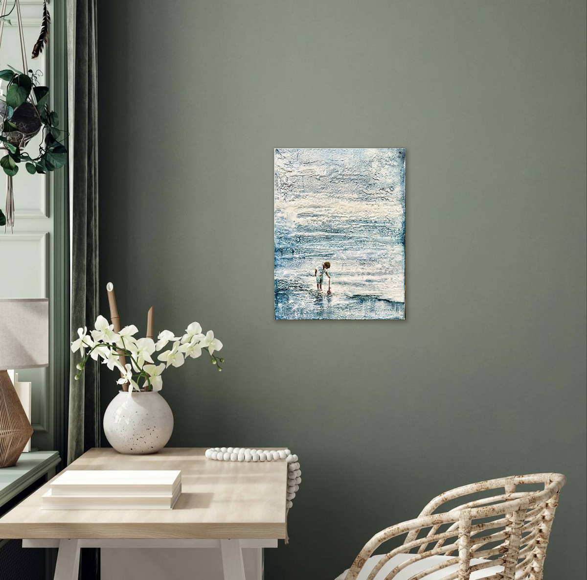 Сюжет темы судьбы, выбора и взаимодействия человека с высшими силами. На полотне изображен мальчик, стоящий на берегу бескрайнего моря. В его руках — кораблик, который он держит за самую верхушку мачты, словно пытаясь удержать его от неизбежного плавания. Море, кораблик, мальчик — всё! смысл. Мальчик на картине — это символ человеческой души, чистоты и невинности. Он стоит на пороге взросления, перед выбором, который определит его судьбу. Его поза выражает одновременно и решимость, и сомнение. Он держит кораблик за мачту, словно пытаясь контролировать то, что по своей природе не может быть контролируемо. Это метафора человеческого стремления управлять своей судьбой, несмотря на её непредсказуемость. Кораблик — это символ жизни, пути, судьбы. Он хрупок и уязвим, как и сама человеческая жизнь. Мальчик держит его за мачту, самую высокую точку, что символизирует его попытку удержать контроль над своим будущим. Но кораблик уже касается воды, и вот-вот уплывет в открытое море. Это момент,