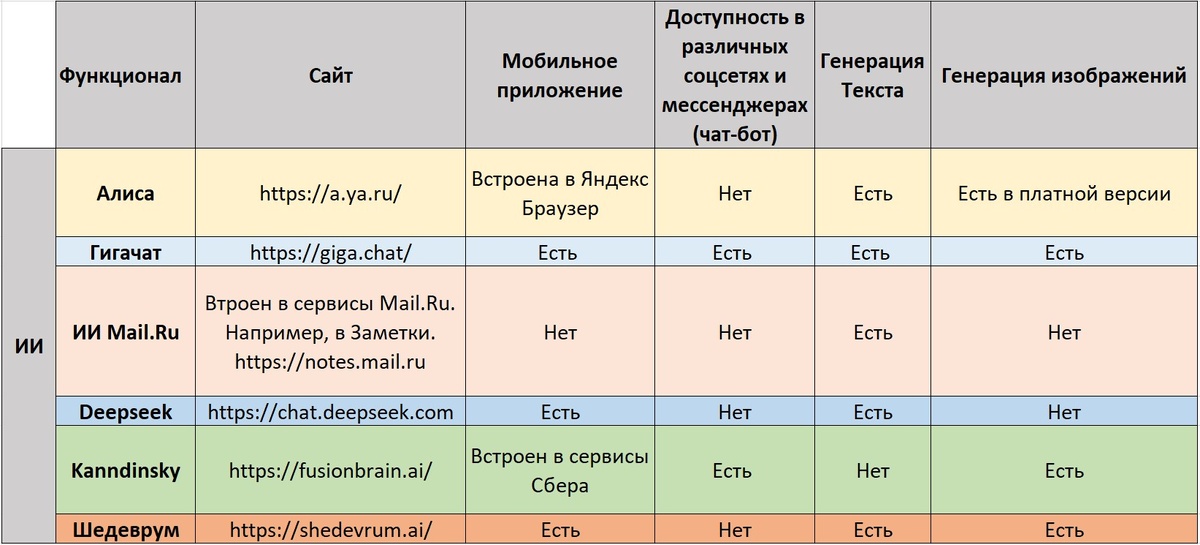 Как видно из таблицы, с доступностью хуже всего у ИИ от Mail.ru. Чтобы его использовать надо иметь тамошний аккаунт и использовать его непосредственно внутри системы. А лидирует по доступности для пользователей Гигачат, у которого, помимо сайта, есть и мобильное приложение, и боты, например, для Телеграма или ВК.