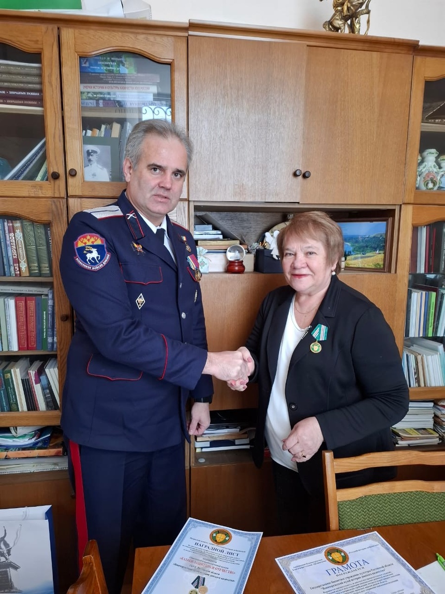 💤 Атаман окружного казачьего общества "Новочеркасский округ" войскового казачьего общества "Всевеликое Войско Донское" Андрей Васильевич Демченко по поручению Председателя наградного комитета АНБО "Русский ветеран-доброволец" Юрия Анатольевича ИВАНОВА вручил награды Новочеркасскому музею истории Донского казачества и лично директору музея Светлане Алексеевне Сединко. Светлана Алексеевна -профессионал, признанный авторитет в музейном мире. Ее труд неоднократно отмечен высокими правительственными наградами. Она носит почётное звание " Заслуженный работник Российской Федерации ".