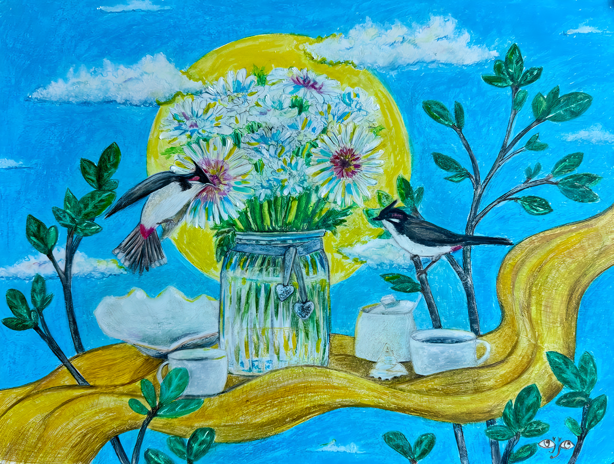Пауза. Чай дымится. Птицы на картине начинают двигаться.