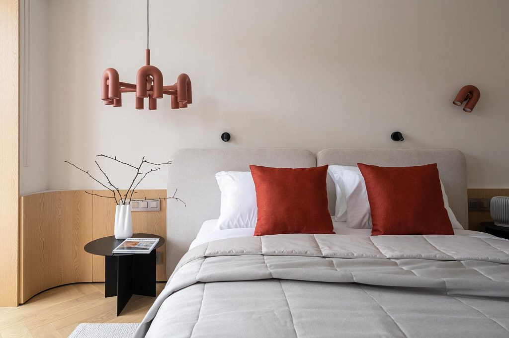 Как из небольшой комнаты сделать комфортное жилое пространство для семьи из четырех человек? Ответ знают дизайнеры «Квартирного вопроса» на НТВ, создавшие уютную спальню в скандинавском стиле. В интерьере, помимо мебели на заказ, разнообразных светильников и аксессуаров они использовали розетки и выключатели SKANDY IEK. Для проекта были выбраны модели в рамках из закаленного стекла в цвете «шампань». Они удачно вписались в скандинавский стиль, отличающийся простотой и лаконичностью. В интерьере преобладают светлые тона, количество украшений сведено к минимуму, в приоритете комфорт и функциональность. Именно такой хотели видеть свою комнату хозяева. Дизайнер пожелание выполнил: комната получилась стильной, в полном соответствии с пришедшей из Северной Европы модой. В спальне появилась светлая мебель и яркие акцентные элементы, на стены нанесена декоративная штукатурка, выкрашенная в бежевый цвет, а нижняя часть отделана МДФ-панелями со шпоном дуба. Прямо на эти панели установлены розет