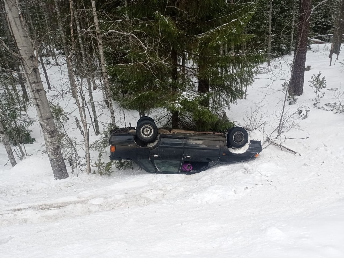 Спасатели и дорожники вытащили из кювета лежавшую на крыше легковушку после аварии в Пряжинском районе