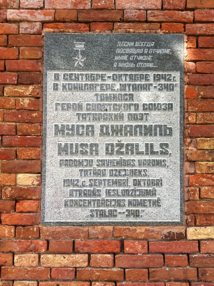 Не знаю, уж снесли латышские националисты этот памятный знак или нет, - я снимал его в 2012 году. Динабургская крепость. Рядом находится латвийский город Даугавпилс. До того, как Ленин в 1918 году подарил новообразованной Латвии окрестные земли вместе с городами, тут был российский город Двинск. Его латыши переименовали в Даугавпилс. Ещё раньше он назывался Динабург. Поэта-фронтовика Мусу Джалиля знал каждый советский школьник. Было в школьной программе. Но ничего не было про то, что в концлагерях на территории Латвии основным рабочим персоналом были местные латыши. Гитлеровцы из Германии занимали командные должности типа начальника лагеря, зам. начальника и около того. В Шталаг-340 погибло более 100 тыс. человек. Отступая, немцы загнали всех оставшихся узников в собор на территории крепости и взорвали. Латышским надзирателям современные латвийские власти засчитали в трудовой стаж работу в Шаталаг-340 и других местных концлагерях в период в 1941-44 гг. Немногие оставшиеся в живых сейча