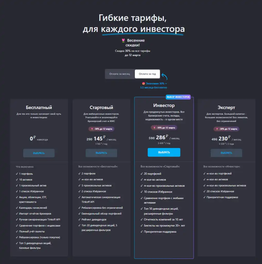 Тариф Инвестор при оплате за год стоит 4900 руб. Мартовская скидка дает экономию в 1470 руб. Годовой платеж со скидкой составит 3430 руб.