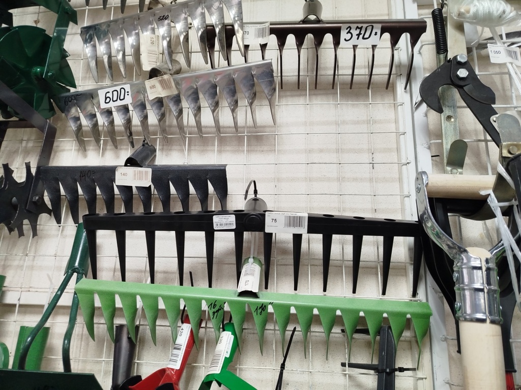 пластинчатые грабли. Первые изготавливают из металла. Они имеют жесткие и упругие зубчики, дополнительную дугу в верхней части основания. Она