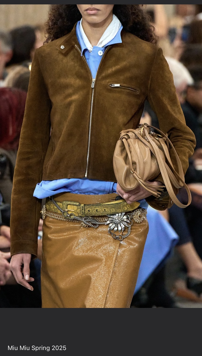 Добрый день! Сегодня предлагаю поговорить на тему применения трендов для себя из всего многообразия выбора. Чтобы не было диссонанса с личностью человека, необходимо от этой самой личности и идти, анализируя тренды чуть глубже, как бы достраивая картину. Молодая легкомысленная девушка может позволить себе сегодня быть легкой нимфой, а завтра подружкой байкера в чопперах. Но после 25-30 лет уже метания из стороны в сторону будут вызывать у окружающих вопросы и подсознательное недоверие. Давайте попробуем на примере разобраться со свежим стилевым приемом от Miu Miu, когда один угол воротничка рубашки торчит из-под джемпера/куртки. Таких примеров на показе было много. Миучча этот прием описывает на примере девушки, которая всегда спешит, поэтому один угол воротничка рубашки торчит из-под джемпера. Ну вот представим, что в реальной жизни такой стилевой прием использовала молодая активная девушка, которая действительно очень подвижная, яркая, легкая. Смотрится это вполне органично, то есть