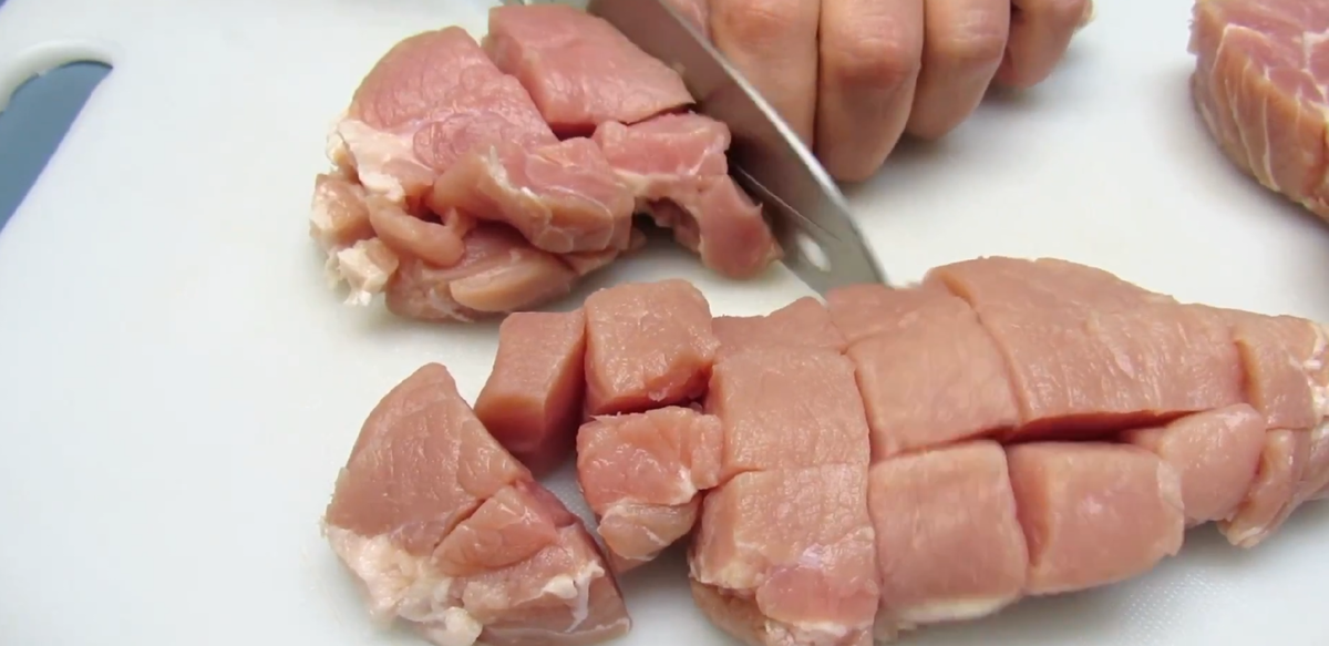 - Нарежьте свинину кубиками 3×3 см .