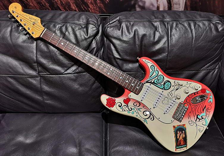 Fender Custom Shop Jimi Hendrix Monterey Pop Stratocaster был выпущен в 1997 году, через 30 лет после фестиваля. Было сделано 210 экземпляров, все они были расписаны вручную Памелиной Х, художником-графиком Fender, которая теперь сама по себе знаменита. Это захватывающее зрелище, и эта модель очень востребована коллекционерами. На наших фотографиях вы увидите, что у гитары также есть некий огромный чехол-конфетка: замшевый чехол (с кисточками!), ремень и пропуск за кулисы, все это надежно упаковано в специально изготовленный дорожный чехол. К счастью, никаких спичек или зажигалок!