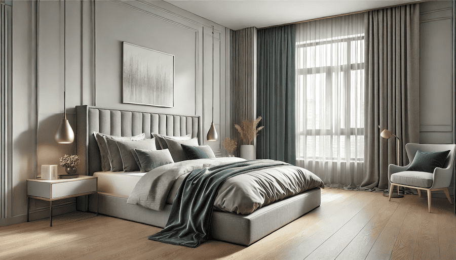 - Серые шторы в тон кровати — создают цельный и элегантный образ.