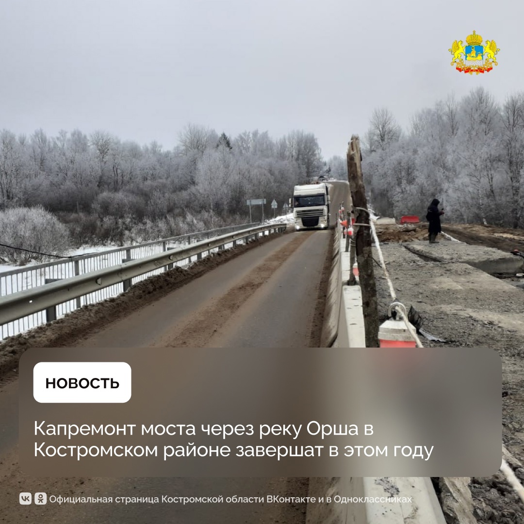Мост через реку Оршу обеспечивает транспортное сообщение с несколькими деревнями Кузнецовского сельского поселения. Наиболее крупный населённый пункт – поселок Василёво, в котором проживает около 600 человек. Здесь находится школа, детский сад, дом культуры, работают магазины, сельскохозяйственное и лесозаготовительное предприятия. В 2023 году по нацпроекту «Безопасные качественные дороги» уже отремонтировали подъездные пути к переправе. В этом году восстанавливают сам мост. Капитальные работы уже начались. Мостостроители демонтировали изношенные конструкции на первой половине переправы. Также на объекте выполняют работы, связанные с армированием насадок опор для увеличения их несущих способностей. На искусственном сооружении будут заменены балки пролётных строений, ригели, шкафные стенки, гидроизоляция, система водоотведения, отремонтированы подходы. Также на мосту запланировано устройство тротуаров, барьерного и перильного ограждений. Срок окончания работ — ноябрь 2025 года. #Костром