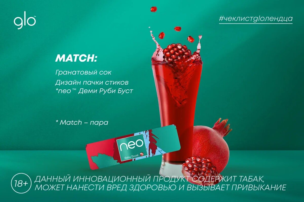 В заведениях #gloленд знают, что к каждому дизайну пачки стиков можно подобрать напиток по цвету. Сегодняшний мэтч: гранатовый сок и дизайн пачки стиков neo Деми Руби Буст – за насыщенность с первого взгляда. Какие сочетания могли бы попасть в #gloленд? 18+ Данный инновационный продукт содержит табак. Может нанести вред здоровью и вызывает привыкание. Пейринг – подбор сочетаний.