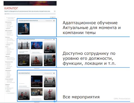 Когда сотрудник открывает этот раздел, то видит большую, удобную и хорошо оформленную страницу. БОльшую ее часть занимают «карточки» — визуально оформленное представление мероприятий корпоративного университета ОМК.