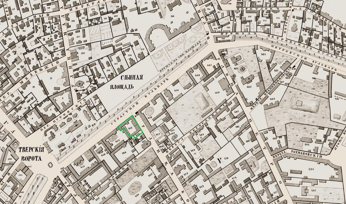 Точнее мы будем говорить не об одном доме, а об одном земельном участке, на котором располагалось несколько домов. И расположен он был на углу Страстного бульвара и улице Большая Дмитровка. Вот он, выделен зеленым на карте 1852 года: