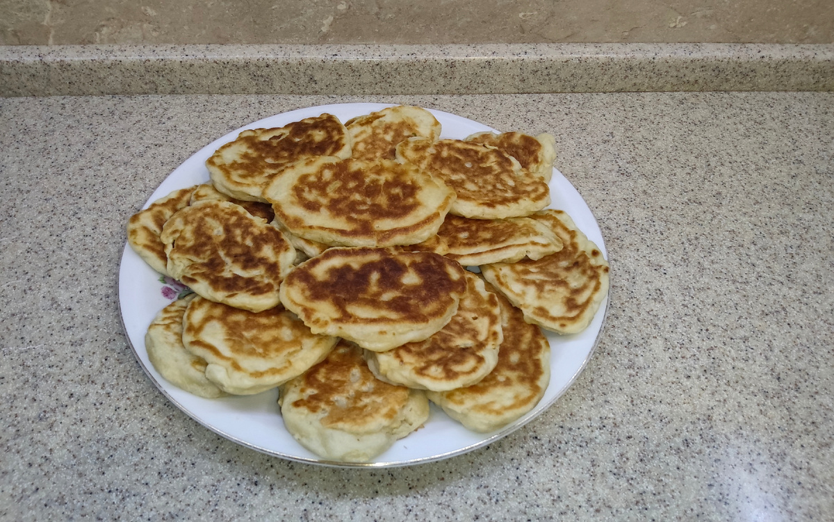 - На 500 граммов пшеничной муки - 2 стакана воды, 2 яйца, 1 столовая ложка сахарного песка, 1/2 чайной ложки соли, 25 граммов дрожжей, 3-4 яблока, растительное масло для жарения.