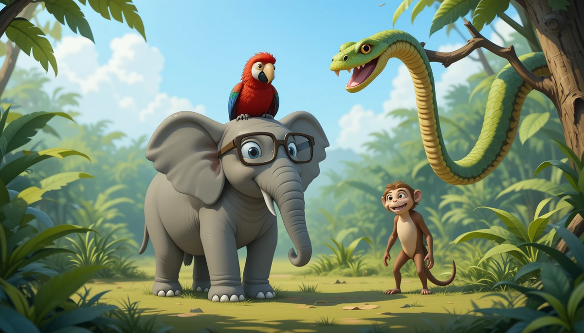 А начнём мы сказку по простому, не будем писать про деревья и облака, а просто, жили-были четверо друзей: слонёнок, мартышка, удав и зелёный попугай. Каждый из них обладал своим уникальным характером: слонёнок — добродушный и всё время был в очках, наверно плохо видел и из-за этого был немного неповоротливый; мартышка — сообразительная, но неуёмно любопытная; удав — горделивый, но не лишённый тщеславия; и попугай — болтливый, но верный друг.Каждый день они придумывали новые приключения, и казалось, что чудеснее их дружбы быть не может.