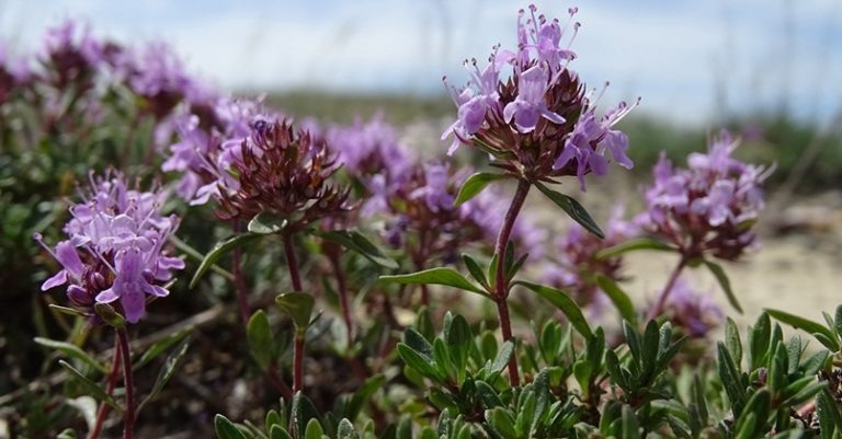 Чабрец – удивительное растение. Он обладает многочисленными полезными свойствами, ярким ароматом и вкусом, поэтому является популярным ингредиентом в кулинарии. А благодаря своим милым цветочкам широко используется в ландшафтном дизайне. Из этой статьи вы узнаете, как растет чабрец, какую почву предпочитает и где его легче всего найти. Содержание Тимьян ползучий, или верест, как еще называют чабрец, – на самом деле небольшой многолетний полукустарник. Основной его стебель, который покрыт тонкой корой, сильно разветвляется и часто укореняется в нескольких местах. У него характерный внешний вид. Темно-красный грубый стебель выдается над землей. На тонких веточках располагается множество маленьких овальных листочков с белыми волосками. Ближе к корню листья светло-серые, а выше – темно-зеленые или сине-зеленые. Сверху стебель усыпан мелкими фиолетовыми цветками. Растение предпочитает хорошо освещенные места и много солнца. Лучше всего растет на легкой, хорошо дренированной, увлажненной поч