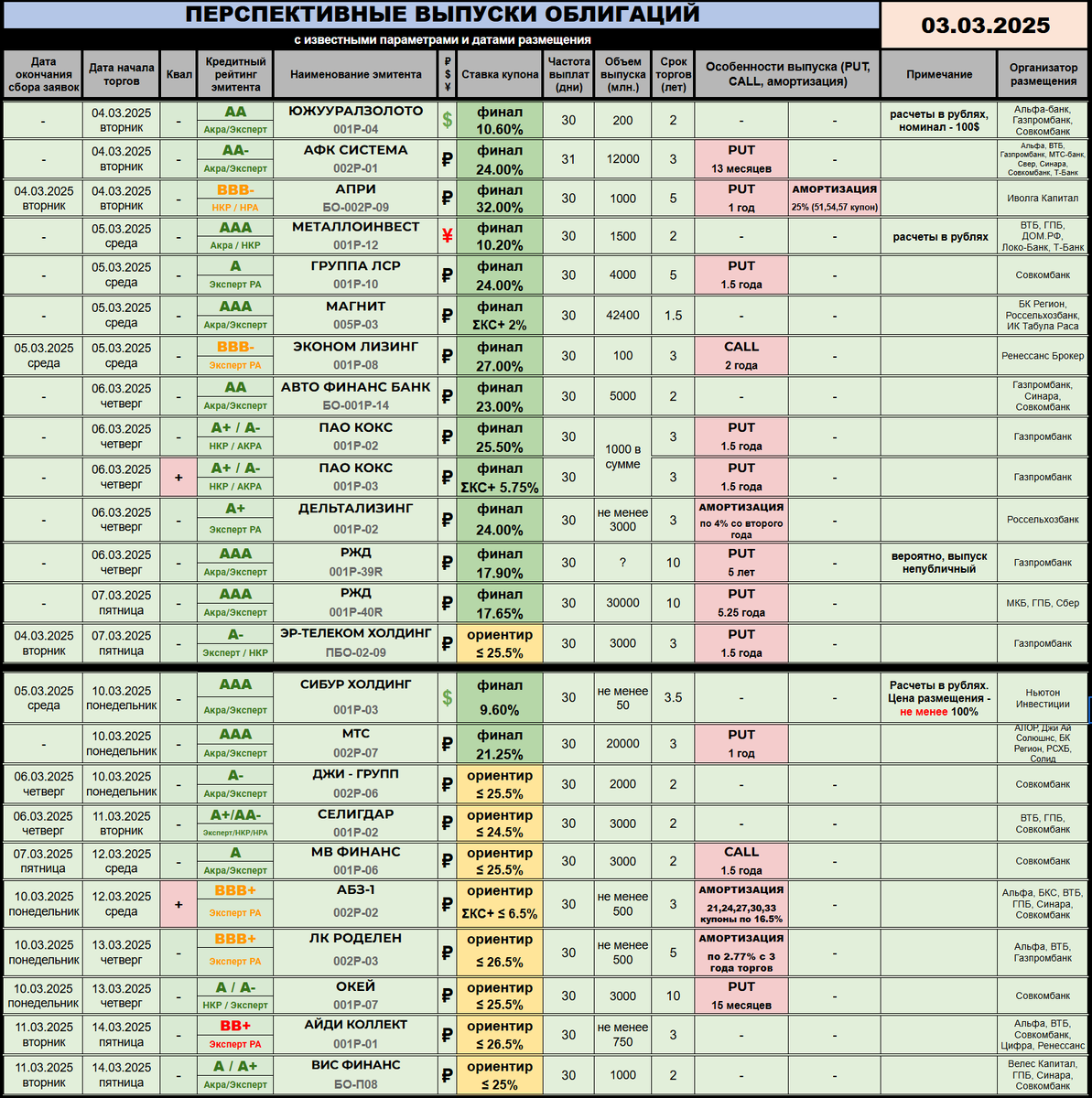 💚 Добрый вечер, друзья! Вестник распрощался со снежинками в оформлении - весне дорогу! Новостей немного, но надо же немножко из-под завалов выпусками выбираться :) ---------- 🆕 НОВЫЕ РАЗМЕЩЕНИЯ / АНОНСЫ: 🌷 СИБУР ХОЛДИНГ (🅰️🅰️🅰️) сообщает, что уже 5 марта пройдет сбор заявок на дополнительный объем по выпуску 001Р-03 $RU000A10AXW4. Объем его составит не менее 50 миллионов долларов (все расчеты по бумаге производятся в рублях), но главная тонкость не в этом. Цена размещения установлена на уровне "не менее 100% от номинала", что подразумевает ее увеличение в ходе сбора. Собственно, и по 102, и по 104% от номинала компания может себе позволить разместиться. А вот остальные параметры останутся нетронутыми: чуть меньше 3,5 лет торгов и ежемесячный купон 9,6%. Торги дополнительным объемом начнутся 10 марта. 🌷 Абсолютно вся первичка снизила стартовые ориентиры: - ДЕЛЬТАЛИЗИНГ - финальная ставка 24% (старт "не выше 24,5%); - КОКС - 25,5% по бумаге с фиксированным до оферты купоном