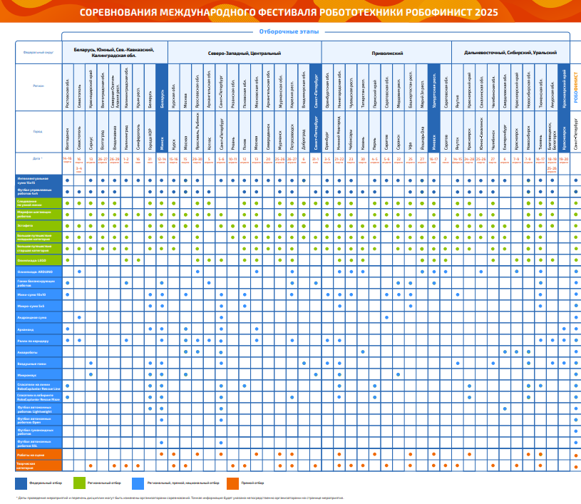 Сам фестиваль проходит в Санкт-Петербурге. Зрителям вход свободный, а вот участникам нет! Для того чтоб принять участие в фестивале нужно пройти отбор, и это отдельное удовольствие. Отбор проходит следующим образом: для каких-то дисциплин (далее категорий) доступен только прямой отбор, для каких-то категорий путевка в финал дается только победителям региональных отборочных, для каких-то только победителям федеральных отборочных, а для каких-то можно и через победу и через прямой отбор. Следом я прикреплю таблицу со всеми категориями, датами и местами соревнований, где они будут представлены. Она огромная, поэтому я также оставлю ссылку на оригинал 25-го года!